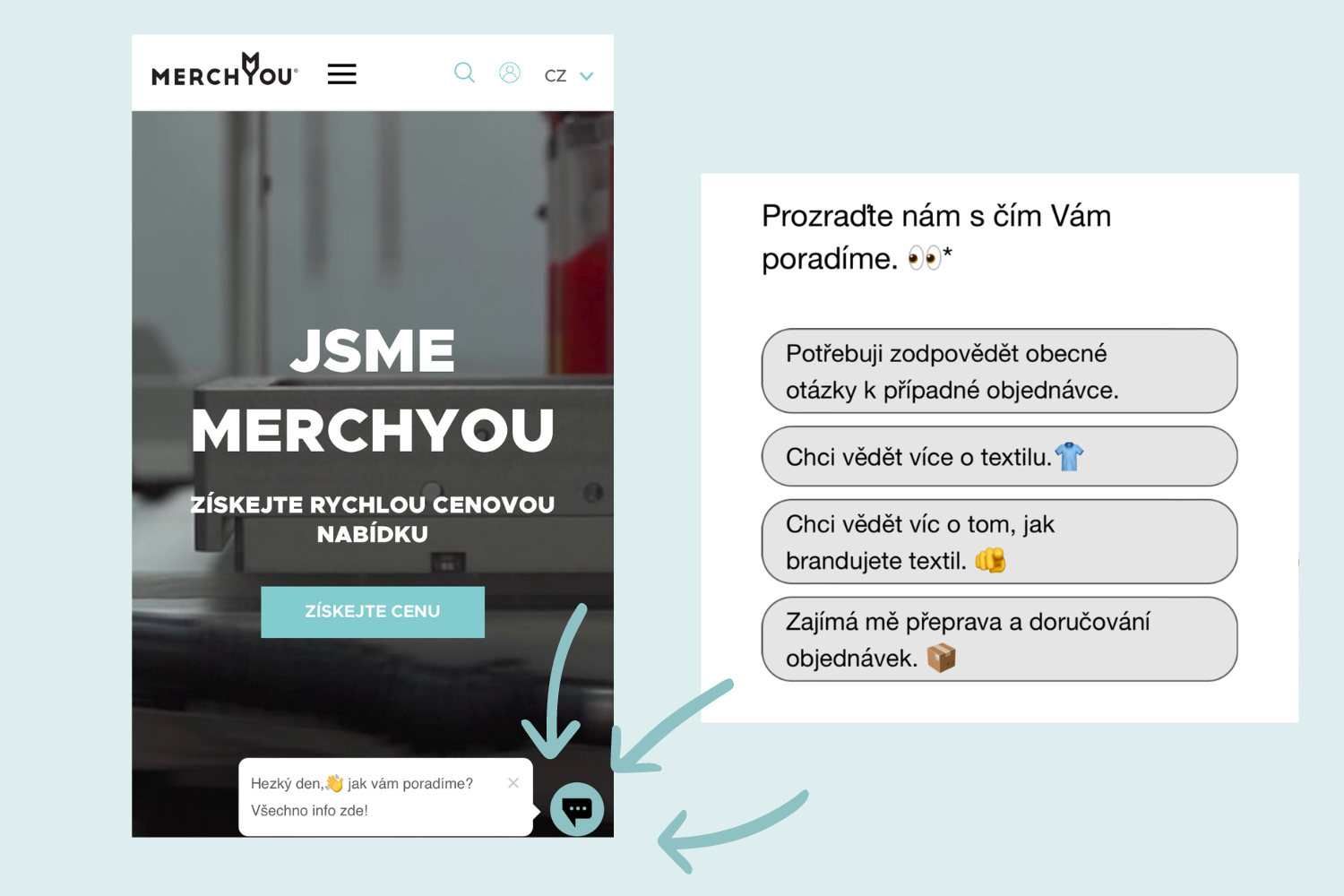 Chatbot je skvělým nástrojem pro první kontakt, takže se ho nebojte vyzpovídat, je k dispozici 24 hodin denně, 7 dní v týdnu. Promluví na vás v pravém dolním rohu a nabídne základní okruhy otázek, které následně rozšíří. Ať už se chcete dozvědět více o našich službách, sortimentu textilu, způsobech brandingu, udržitelnosti nebo expedici objednaného zboží, zaručeně zde najdete potřebné odpovědi. .