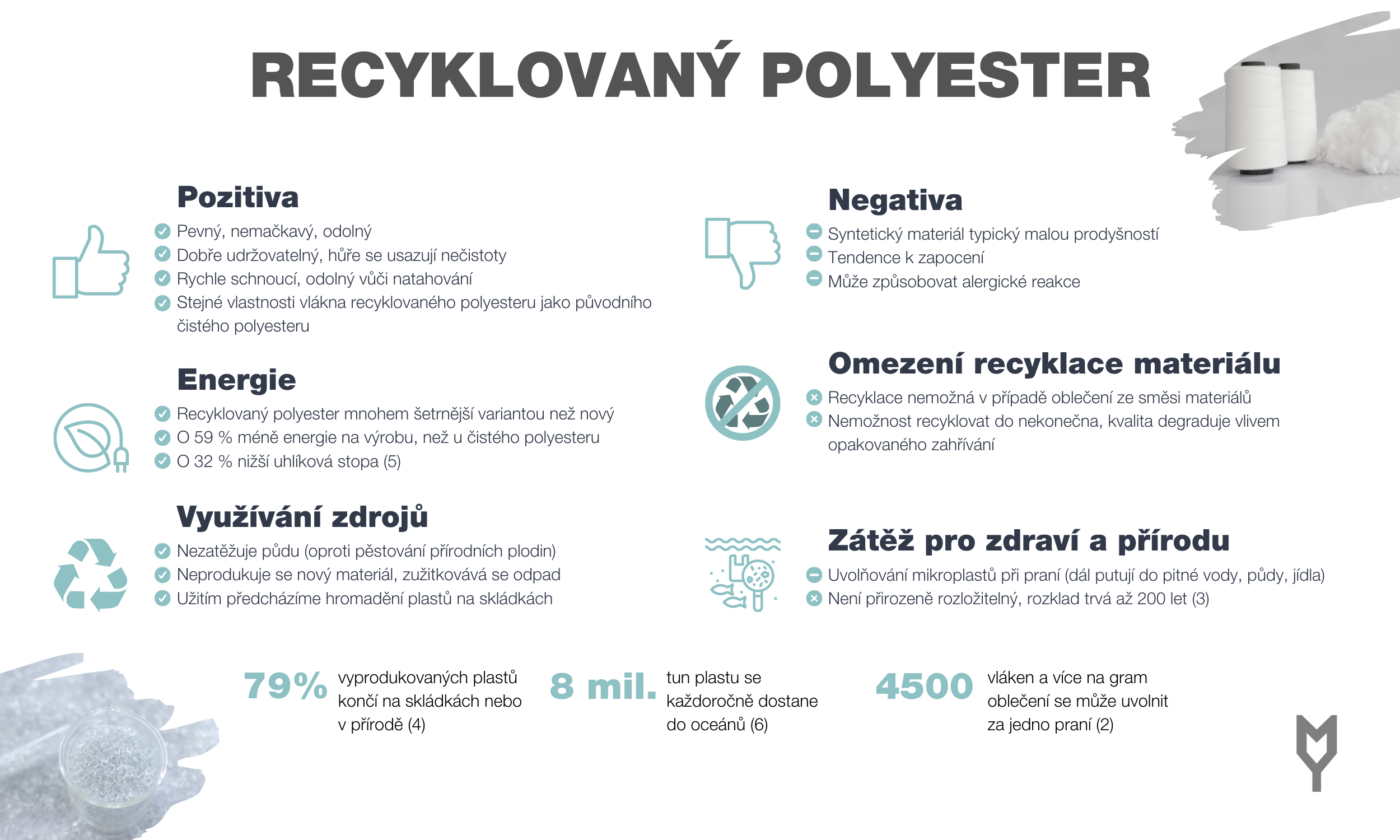 Zatím nám však recyklovaný polyester může sloužit jako skvělý nástroj přeměny odpadu ničícího přírodu na opětovně využitelný materiál. Ačkoliv je recyklace plastu pomalu na vzestupu, zatím se recykluje pouze 9 % plastů (4). Volbou recyklovaného polyesteru před čistým polyesterem to máme možnost změnit. Buďme ohleduplní, recyklujme i náš odpad a dejme mu tak šanci být znovu využit!