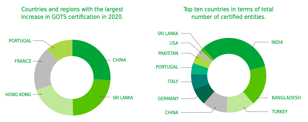 • The largest growth in GOTS certifications in 2020 (countries and regions) are: China (114%), Sri Lanka (103%), Hong Kong (87%), France (82%) and Portugal (49%).