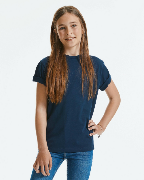 - Russell Pure Organic Kid‘s Pure Organic Tee (French Navy): sizes 3-14 years – 100% organic cotton (GOTS, Oeko-Tex)