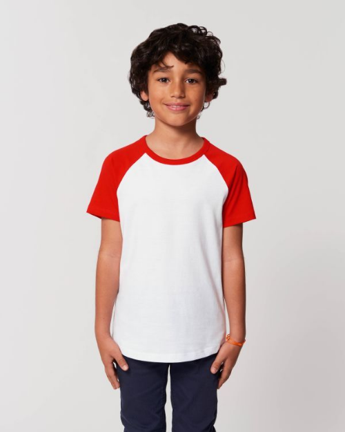 - Stanley/Stella Mini Catcher Short Sleeve (White/Bright Red): sizes 3-14 years – 100% organic cotton (GOTS, Oeko-Tex, Fair Wear)