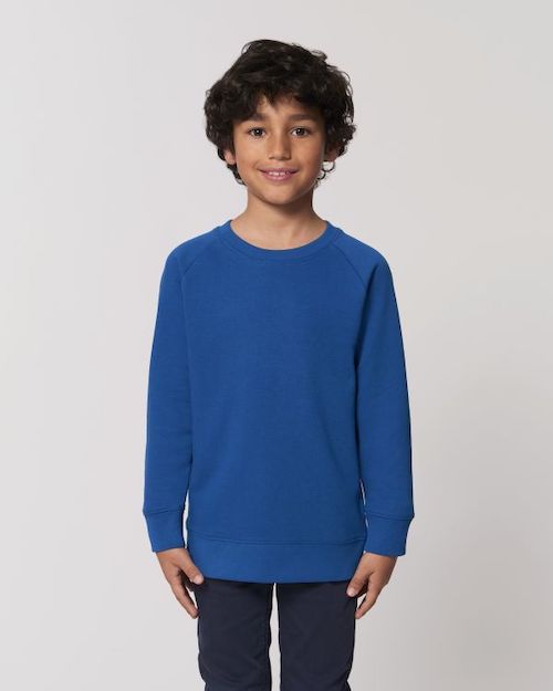 - Stanley/Stella – Mini Scouter Crew neck (Majorelle Blue): sizes 3-14 years – 85% organic cotton, 15% recycled polyester (GOTS, Oeko-Tex, Fair Wear, Recycled)