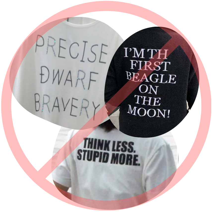 You can also play with the placement of the print - for example, leave only a small text hidden on the edge of the shirt for the most observant. Or place an inscription on the front that will force passers-by to turn around towards the wearer, and perhaps a sequel, explanation or a funny point will appear on the back.