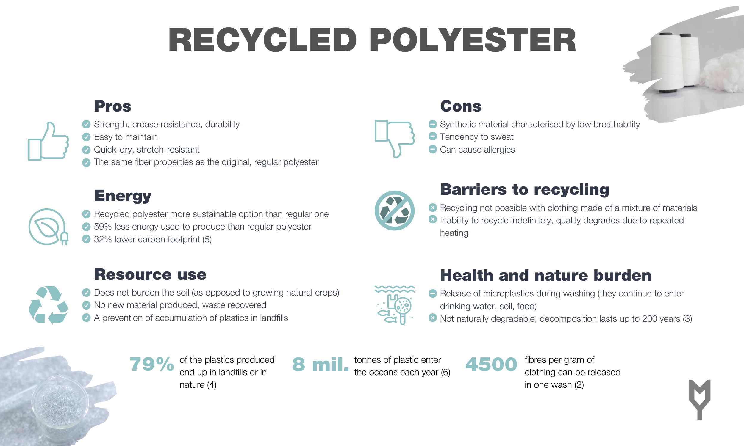 So far, however, recycled polyester can serve as a great tool for transforming waste that destroys nature into reusable material. Although plastic recycling is slowly on the rise, so far only 9% of plastics are recycled (4). By choosing recycled polyester over regular polyester, we have the opportunity to change that. Let's be considerate, recycle our waste and give it a chance to be reused!