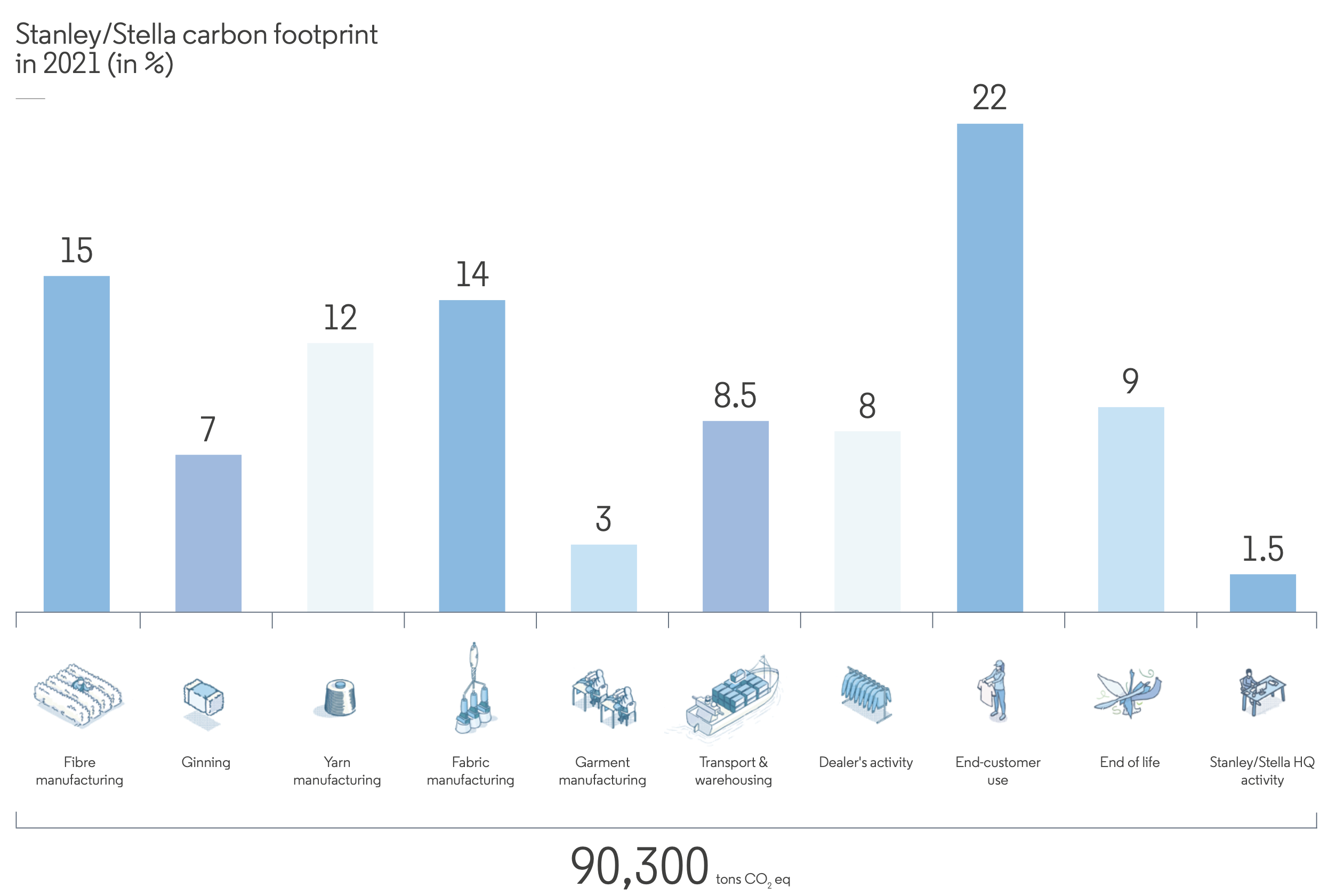In 2022, Stanley/Stella measured carbon emissions throughout their supply chain in collaboration with their external partners. According to the GHG Protocol standard, together with the Bilan Carbone® method, all carbon emissions at every stage of production, from raw materials through product manufacturing, final decoration to customer use and end of life were calculated.