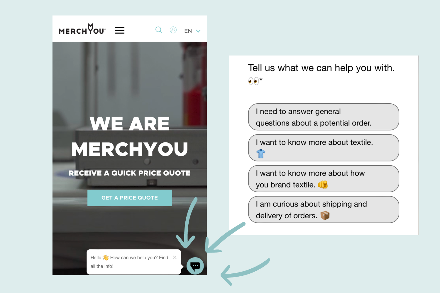 The chatbot is a great tool for first contact, so don't be afraid to interview it, it's available 24 hours a day, 7 days a week. It will speak to you in the bottom right hand corner offering basic question headings which are then expanded upon. Whether you want to know more about our services, our range of textile products, our branding methods, sustainability or the shipping of the ordered products, you are guaranteed to find the answers you need here.