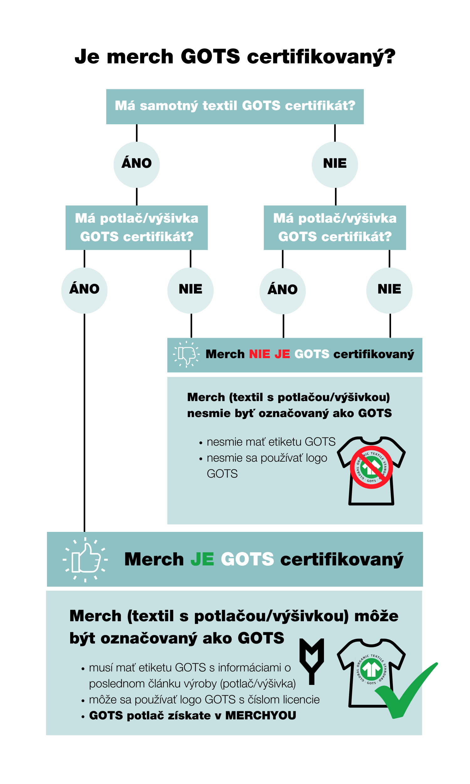 Ak pôvodne GOTS certifikovaný textil nie je potlačený v GOTS certifikovanej tlačiarni, akou je napríklad MERCHYOU, nesmie sa pýšiť ani pôvodným GOTS logom výrobcu textilu. Taký textil bol totiž „znehodnotený“ konvenčnou potlačou a o výslednom produkte ďalej nemôžeme hovoriť ako o GOTS certifikovanom.