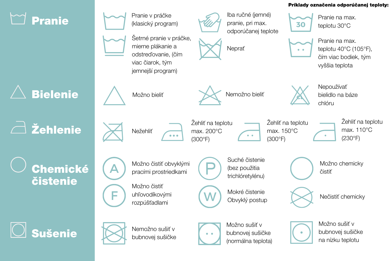 Na ceduľkách môžeme nájsť množstvo rôznych pracích symbolov, ktoré sa navyše môžu líšiť podľa rôznych systémov značenia. Pripomenieme si význam tých najčastejšie používaných symbolov: